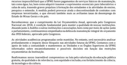 Segundo a nota:”” não há eficiência administrativa que supere um corte de tamanho monte, principalmente diante das sucessivas restrições orçamentárias dos últimos anos. O bloqueio de 30% dos recursos impossibilitará que a UFMG honre os pagamentos de serviços básicos de manutenção, tais como água, luz, bem como adquirir insumos e suprimentos essenciais para laboratórios e salas de aula, trazendo graves prejuízos à formação dos estudantes e às atividades de ensino, pesquisa e extensão. A medida poderá provocar ainda a descontinuidade de contratos com empresas terceirizadas, o que elevará também mais as aviltantes taxas de desemprego do Estado de Minas Gerais e do país.””